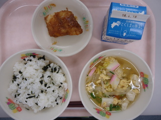 わかめご飯♪牛乳♪さわらのごまみそかけ♪かきたま汁♪エネルギー765kcal、たんぱく質32.2g、脂質25.1g