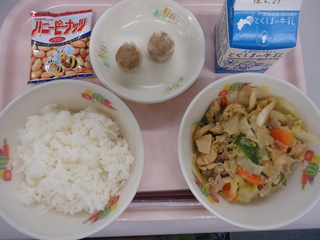 米飯♪ほいこうろう♪ポークしゅうまい♪ハニーピーナッツ♪牛乳♪エネルギー749kcal、たんぱく質30.9g、脂質25.1g