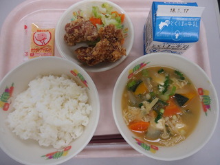 米飯♪若鶏の竜田揚げ♪ゆで野菜♪サウザンアイランドドレッシング♪味噌汁♪エネルギー726kcal、たんぱく質27.5g、脂質24.1g