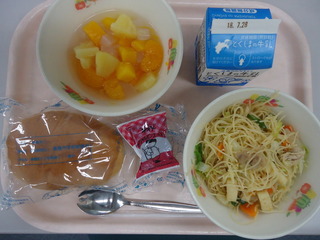 小型パン♪チョコ大豆クリーム♪焼きビーフン♪ナタデココ入りフルーツポンチ♪エネルギー775kcal、たんぱく質26.5g、脂質23.3g