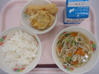 米飯♪いかの天ぷら♪さつまいもの天ぷら♪そうめん汁♪エネルギー691kcal、たんぱく質25.1g、脂質19.1g
