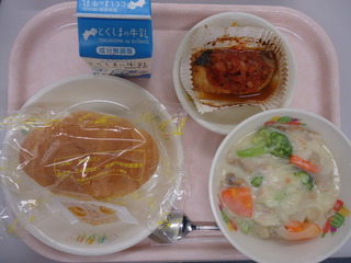 全粒粉パン♪マーマレードジャム♪すずきのトマトソース♪ベーコンと花野菜のクリーム煮♪牛乳♪エネルギー732kcal、たんぱく質29.7g、脂質24.7g