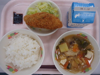 米飯♪ホキフライ♪ゆでキャベツ♪ソース♪味噌汁♪牛乳♪エネルギー676kcal、たんぱく質25.3g、脂質15.8g