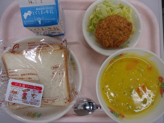セルフサンド(食パン・ヒレカツ・ゆでキャベツ・マヨ&ソース)♪パンプキンポタージュ♪牛乳♪エネルギー679kcal、たんぱく質28.1g、脂質25.9g