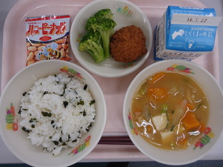 わかめご飯♪鮭フライ♪ゆでブロッコリー♪味噌汁♪ハニーピーナッツ♪牛乳♪エネルギー720kcal、たんぱく質25.4g、脂質20.3g