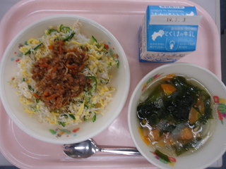 ビビンバ(米飯)♪わかめスープ♪牛乳♪エネルギー685kcal、たんぱく質30.6g、脂質19.4g