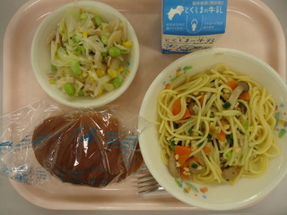 小型黒糖パン♪和風きのこスパゲティ♪れんこんサラダ♪牛乳♪エネルギー688kcal、たんぱく質24.6g、脂質22.3g