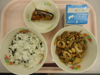 わかめご飯♪牛乳♪大豆入りきんぴら♪さんまのおかか煮♪エネルギー769kcal、たんぱく質30.7g、脂質27.6g