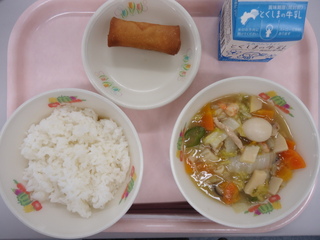 米飯♪牛乳♪八歩菜♪春巻き♪エネルギー679kcal、たんぱく質28.8g、脂質19.3g