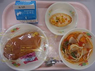 パン♪チョコ大豆クリーム♪牛乳♪ミネストローネ♪かぼちゃグラタン♪エネルギー743kcal、たんぱく質20.1g、脂質31.4g