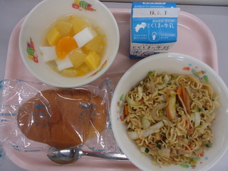 小型パン♪牛乳♪いかやきそば♪杏仁入りフルーツポンチ♪エネルギー697kcal、たんぱく質28.4g、脂質18.4g