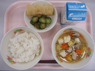 米飯♪牛乳♪いかの天ぷら♪かつおきゅり♪さつま汁♪エネルギー726kcal、たんぱく質30.4g、脂質19.6g