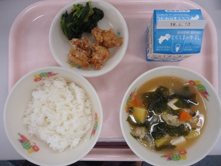 米飯♪牛乳♪若鶏の竜田揚げ♪ほうれん草のおひたし♪味噌汁♪エネルギー742kcal、たんぱく質27.7g、脂質24.2g