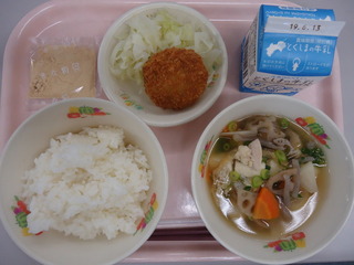 米飯♪きなこふりかけ♪牛乳♪鮭フライ♪ゆでキャベツ♪けんちん汁♪エネルギー672kcal、たんぱく質23.3g、脂質16.8g