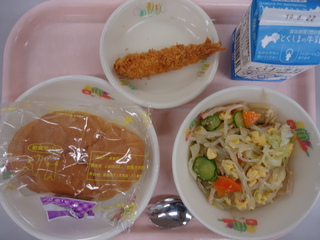 全粒粉パン♪レーズンクリーム♪牛乳♪ばんさんすう♪えびフライ♪エネルギー711kcal、たんぱく質24.2g、脂質27.2g