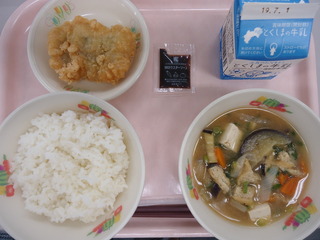 米飯♪牛乳♪はもの天ぷら♪ソース♪味噌汁♪エネルギー649kcal、たんぱく質23.2g、脂質19.0g