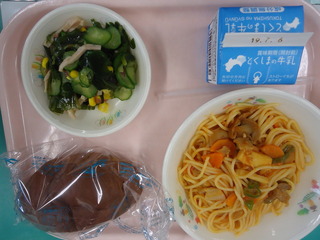 小型ココアパン♪牛乳♪スパゲティナポリタン♪海そうサラダ♪エネルギー680kcal、たんぱく質28.0g、脂質19.7g