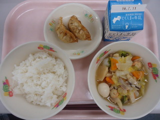 米飯♪八宝菜♪ぎょうざ♪牛乳♪エネルギー697kcai、たんぱく質29.0g、脂質20.8g
