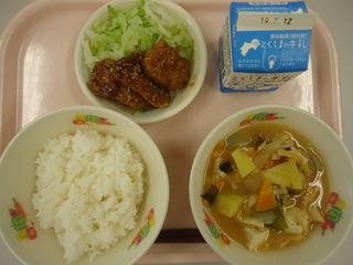 米飯♪豚肉のごまがらめ♪ゆでキャベツ♪味噌汁♪牛乳♪エネルギー739kcal、たんぱく質32.6g、脂質18.7g