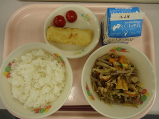 米飯♪昆布と豚肉の炒め煮♪いかの天ぷら♪ミニトマト♪牛乳♪エネルギー717kcal、たんぱく質29.4g、脂質20.6g