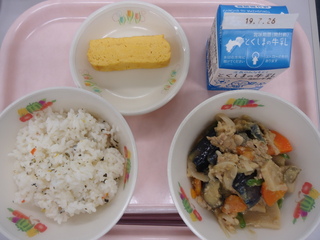 いろどりご飯♪なすと豚肉の味噌炒め♪厚焼きたまご♪牛乳♪エネルギー706kcal、たんぱく質28.9g、脂質23.0g