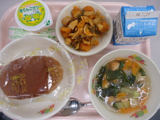 黒糖パン♪えびとカシューナッツの炒め物♪中華スープ♪青りんごゼリー♪牛乳♪エネルギー748kcal、たんぱく質30.0g、脂質22.0g