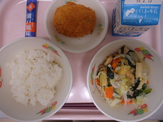 米飯♪瀬戸ふりかけ♪野菜炒め♪ポテトコロッケ♪牛乳♪エネルギー767kcal、たんぱく質24.2g、脂質26.9g