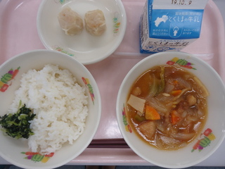 米飯♪小松菜漬♪酢豚♪えびしゅうまい♪牛乳♪エネルギー756kcal、たんぱく質29.3g、脂質22.7g