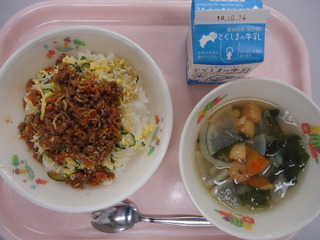 ビビンバ(米飯)♪わかめスープ♪牛乳♪エネルギー685kcal、たんぱく質30.6g、脂質19.4g