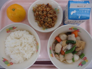 米飯♪いもたき♪大豆とちりめんの揚げ煮♪みかん♪牛乳♪エネルギー775kcal、たんぱく質26.7g、脂質18.5g