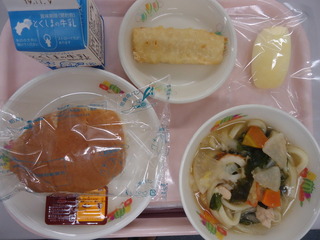 小型全粒粉パン♪あん&マーガリン♪根菜うどん♪いかの天ぷら♪りんご♪牛乳♪エネルギー822kcal、たんぱく質29.8g、脂質25.5g