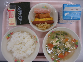 手巻きご飯(米飯、かにかま、卵焼き、ウインナー、ちくわ、ごまたくあん、ハーフマヨネーズ、手巻きのり)♪石狩汁♪牛乳♪エネルギー755kcal、たんぱく質32.2g、脂質21.1g