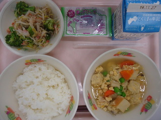 米飯♪ごまひじき♪高野豆腐の卵とじ♪酢の物♪牛乳♪エネルギー700kcal、たんぱく質31.7g、脂質19.3g