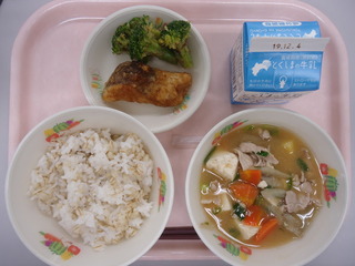 麦ご飯♪メルルーサのすだち風味♪ブロッコリーのおかかあえ♪さつま汁♪エネルギー739kcal、たんぱく質33.8g、脂質19.5g