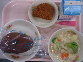 小型ココアパン♪ほたて貝と花野菜のクリーム煮♪かぼちゃサンドフライ♪牛乳♪ミルメークいちご♪エネルギー812kcal、たんぱく質27.4g、脂質29.5g