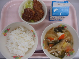 米飯♪豚肉のごまがらめ♪ゆでキャベツ♪味噌汁♪牛乳♪エネルギー739kcal、たんぱく質32.6g、脂質18.7g