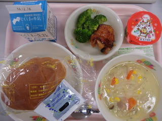 パン♪ブルーベリージャム♪鶏肉の照り焼き♪ゆでブロッコリー♪コーンポタージュ♪いちごプリン♪牛乳♪エネルギー780kcal、たんぱく質27.3g、脂質28.8g