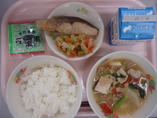 米飯♪鮭の塩焼き♪おひたし♪雑煮♪黒豆♪牛乳♪エネルギー768kcal、たんぱく質30.3g、脂質16.2g