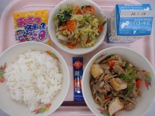 米飯♪瀬戸ふりかけ♪豚肉とこんにゃくの味噌炒め♪ちぐさあえ♪おさつスティック♪牛乳♪エネルギー672kcal、たんぱく質28.9g、脂質18.7g