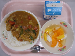 冬カレーライス(米飯)♪杏仁入りフルーツポンチ♪牛乳♪エネルギー760kcal、たんぱく質22.7g、脂質19.4g