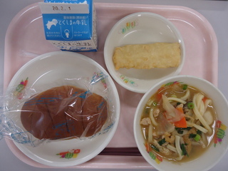 小型黒糖パン♪うちこみうどん♪いかの天ぷら♪牛乳♪エネルギー786kcal、たんぱく質28.3g、脂質16.9g