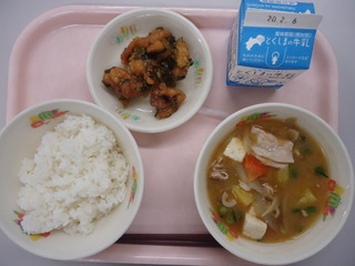 米飯♪若鶏のねぎソースあえ♪さつま汁♪牛乳♪エネルギー837kcal、たんぱく質34.9g、脂質29.0g