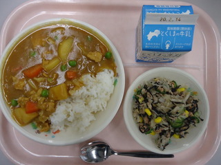 カレーライス(玄米ご飯)♪切り干し大根のサラダ♪牛乳♪エネルギー758kcal、たんぱく質26.2g、脂質24.1g