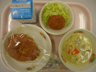 フルーツパン♪鮭フライ♪ゆでキャベツ♪コーンポタージュ♪牛乳♪エネルギー715kcal、たんぱく質22.1g、脂質25.4g