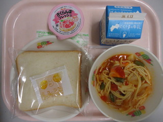 食パン♪マーマレードジャム♪ミネストローネスパゲティ♪さくらんぼゼリー♪牛乳♪