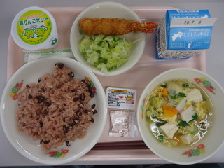 赤飯♪ごま塩♪えびフライ♪ゆでキャベツ♪タルタルソース♪かきたま汁♪牛乳♪エネルギー708kcal、たんぱく質24.2g、脂質19.8g