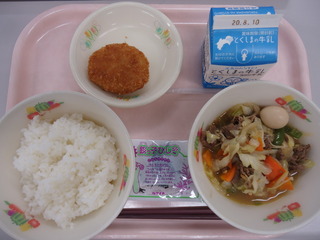 米飯♪ごまひじき♪牛肉とうずら卵の炒め物♪えびカツ♪牛乳♪エネルギー757kcal、たんぱく質31.2g、脂質24.7g