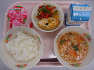米飯♪かぼちゃグラタン♪ごまピーマン♪トマトスープ♪いちごアイス♪エネルギー739kcal、たんぱく質22.6g、脂質20.2g