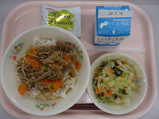 牛肉(米飯)♪すだち酢あえ♪ハニーピーナッツ♪牛乳♪エネルギー705kcal、たんぱく質28.0g、脂質21.7g