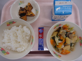 米飯♪かつおふりかけ♪野菜炒め♪大学芋♪牛乳♪エネルギー755kcal、たんぱく質22.0g、脂質23.0g